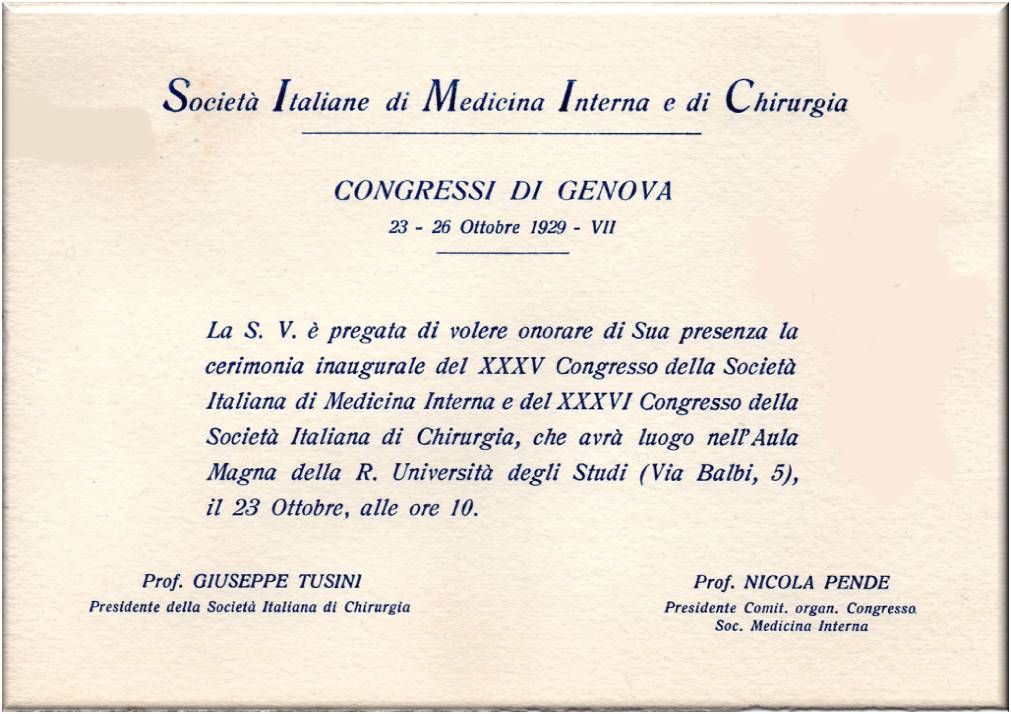 Biglietto di invito al XXXV Congresso della Società Italiana di Medicina interna e del XXXVI Congresso della Società Italiana di Chirurgia, che avrà luogo nell'Aula Magna della R. Università degli Studi (Via Balbi, 5), il 23 Ottobre 1929, alle ore 10.