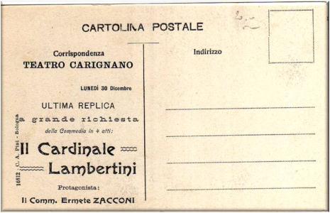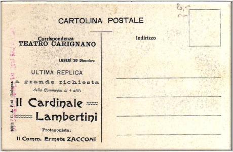 La cartolina pubblicizza l'ultima replica pe lunedì 30 dicembre al teatro Carignano.