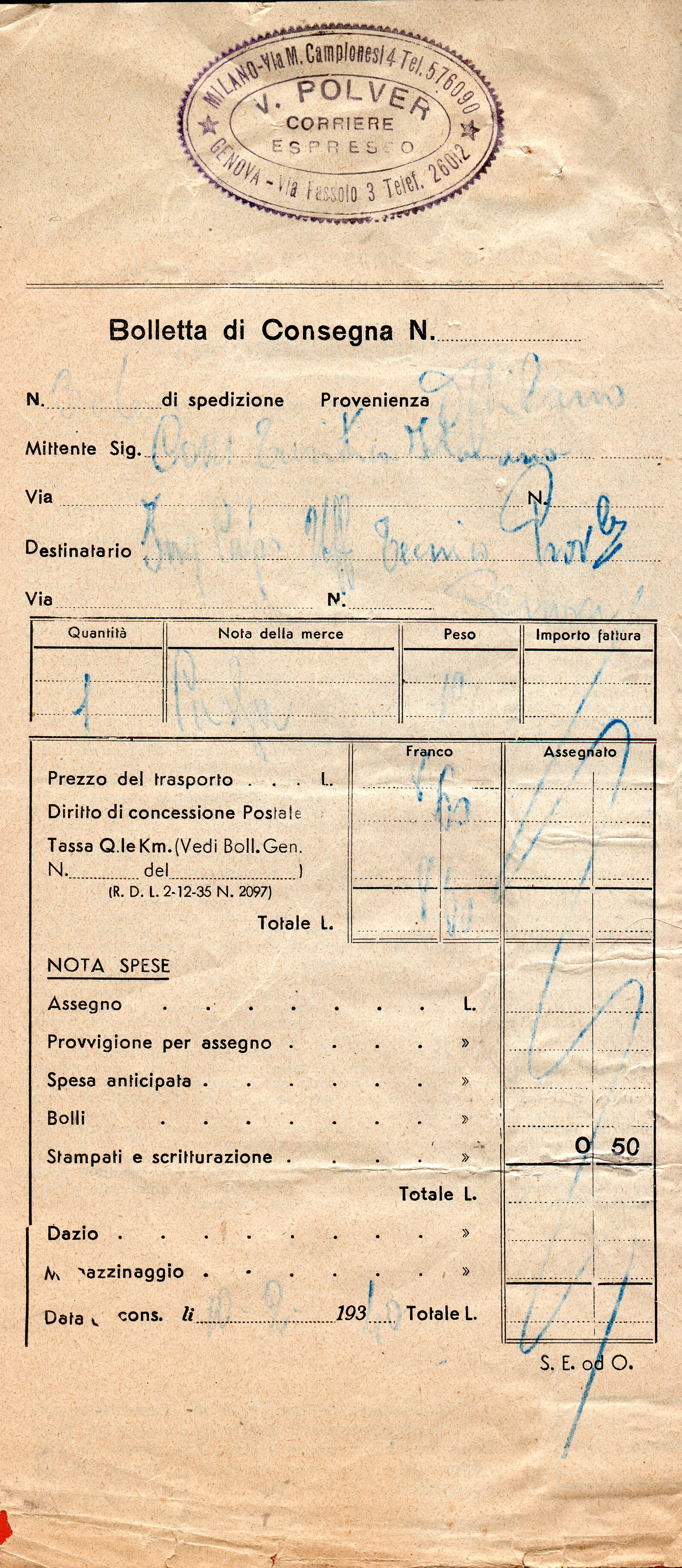 Bolletta utilizzata in data 10 febbraio 1940