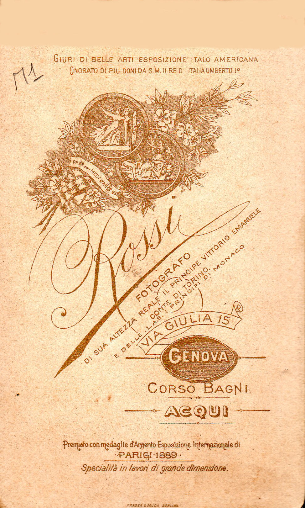 Premiato con medaglia d'Argento Esposizione Internazionale Parigi 1889.