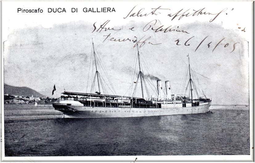 Duca di Galliera costruito nel 1883, mentre nel 1887 venne acquistato dalla Soc.Transatlantica Mexicana e ribattezzato Duca di Galliera, 1906 viene demolito, la sua stazza era di 4,3 tsl.