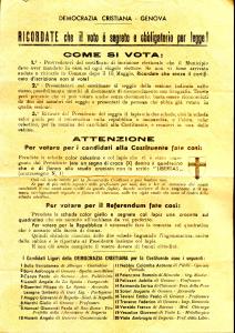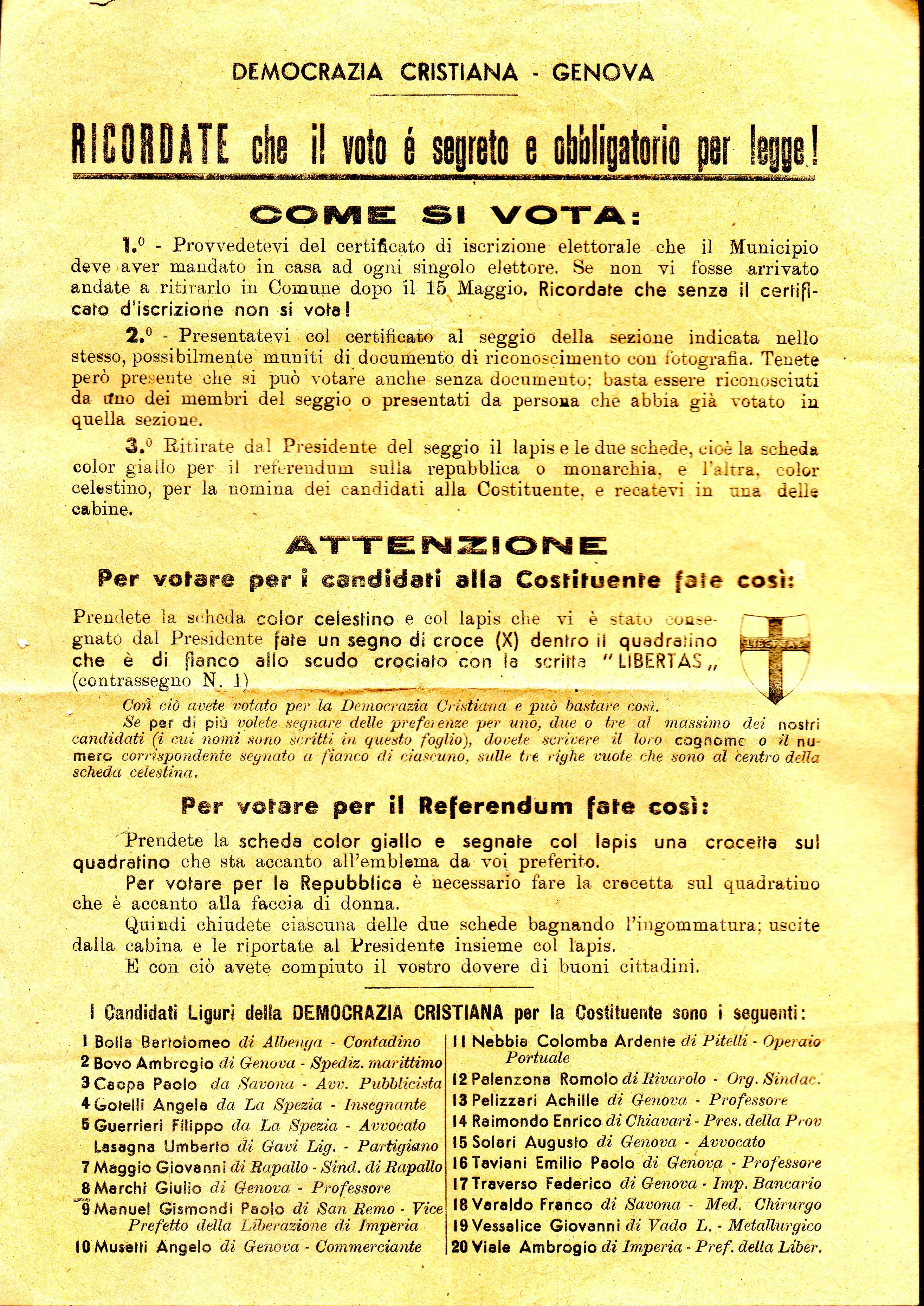 Vlantino con le indicazioni per votare al Referendum Monarchia o Repubblica, e per eleggere i membri dell'assemblea costituente.