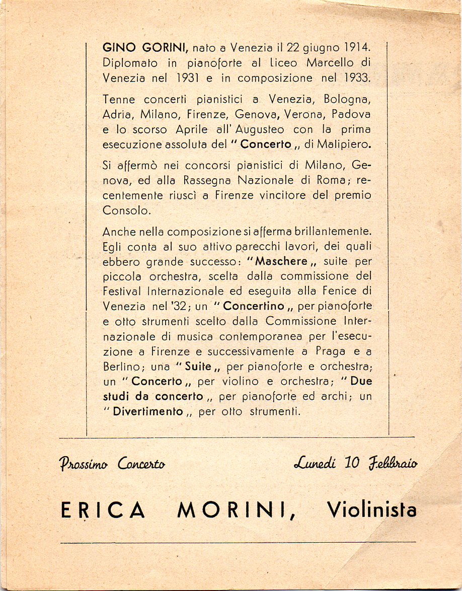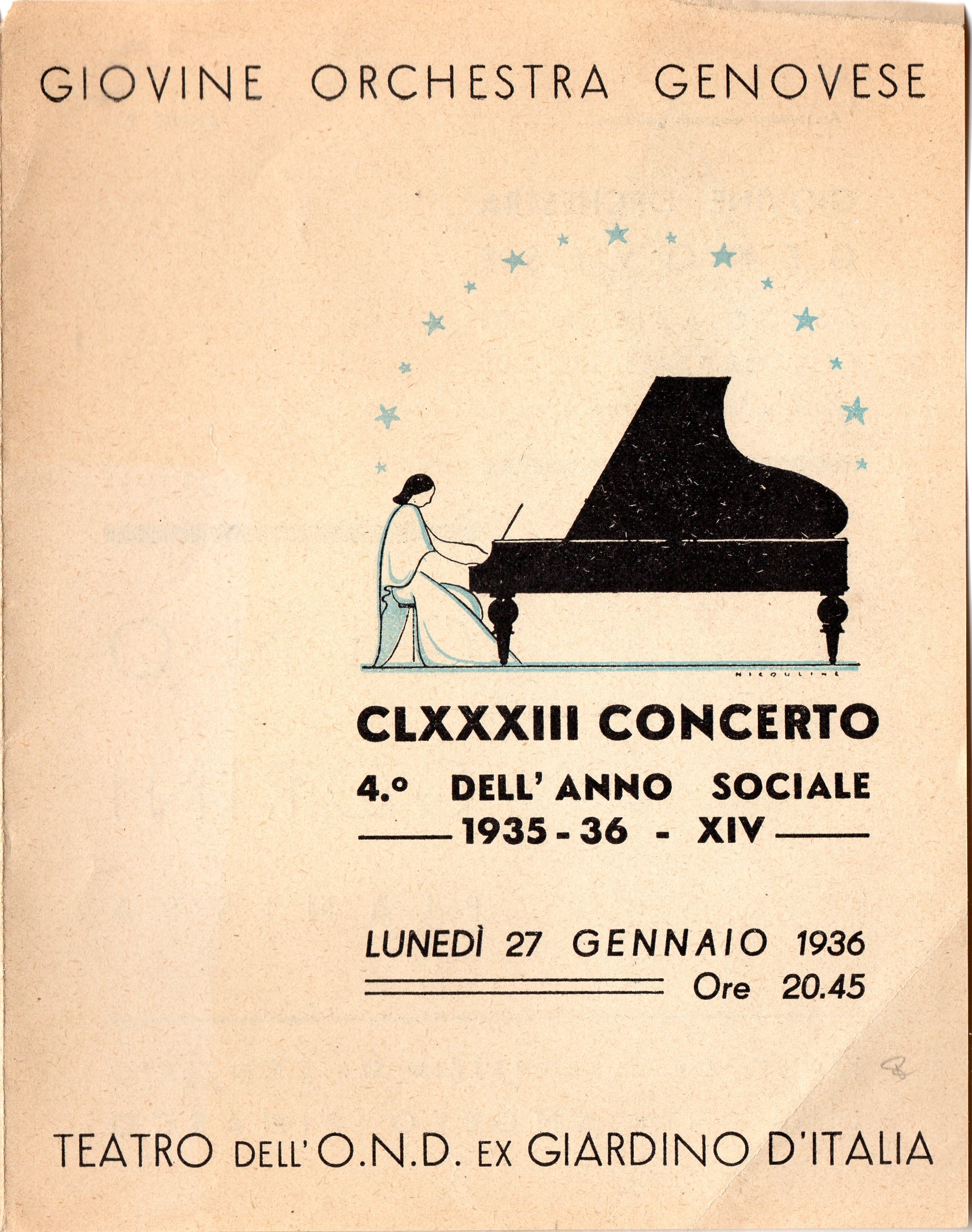 Il 4° concerto sociale della stagione 1935-36 si è svolto nel teatro dell'Opera Nazionale Balilla ex Giardino d'Italia.