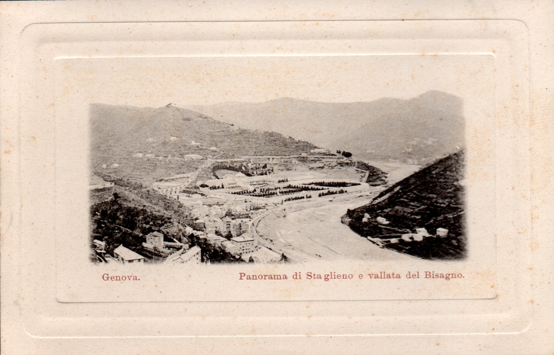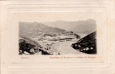 Cartolina riproducente la Valbisagno con il panorama di Staglieno