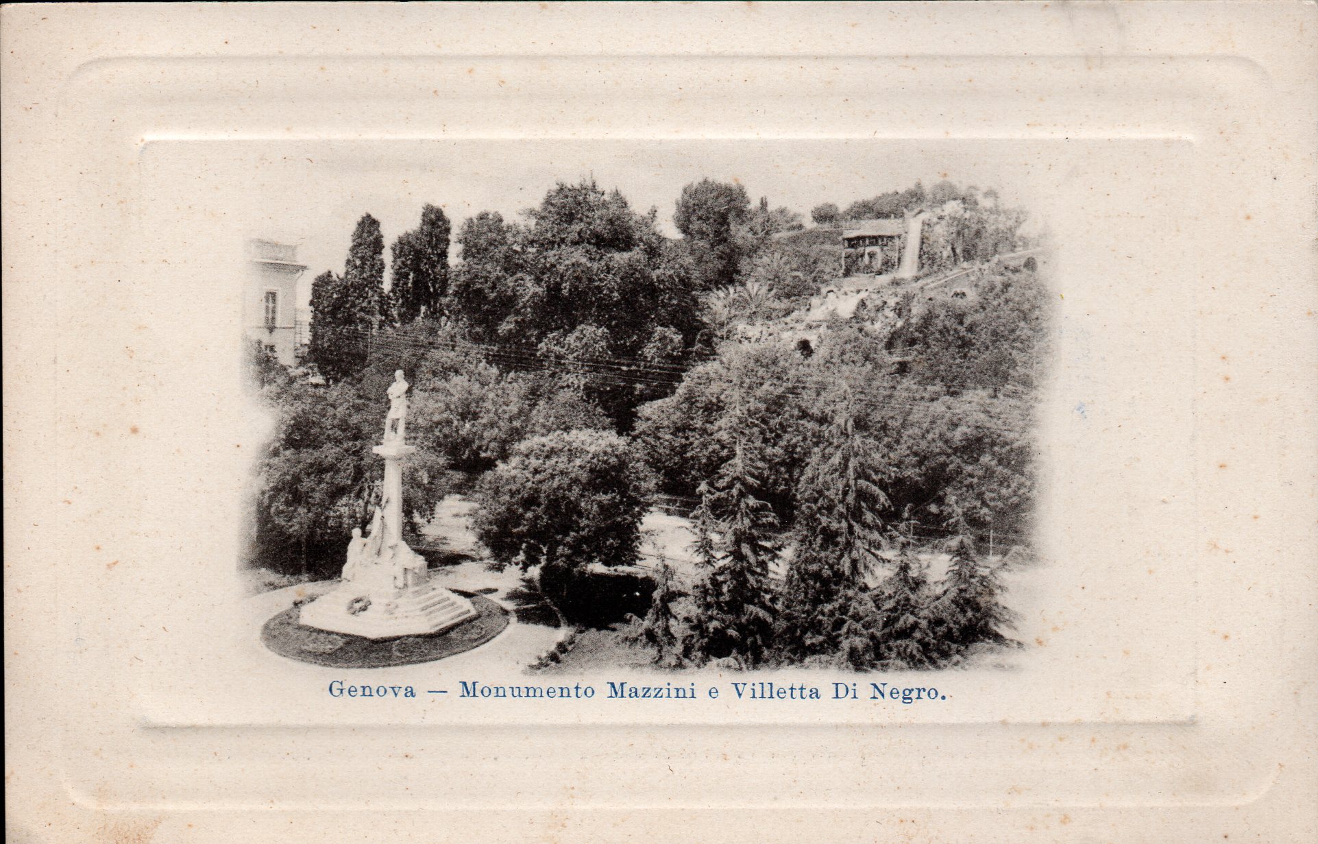 Cartolina riproducente il monumento a Mazzini e villetta Di Negro