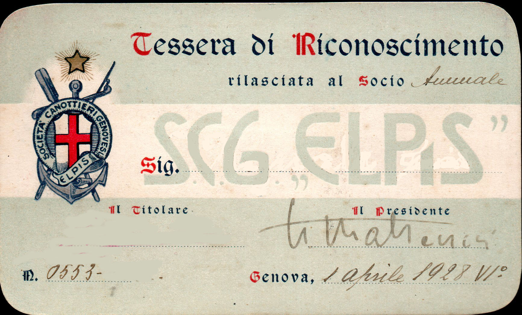 Tessara di Riconoscimento della SOCIETA' CANOTTIERI GENOVESI, rilasciata il 1° aprile 1928