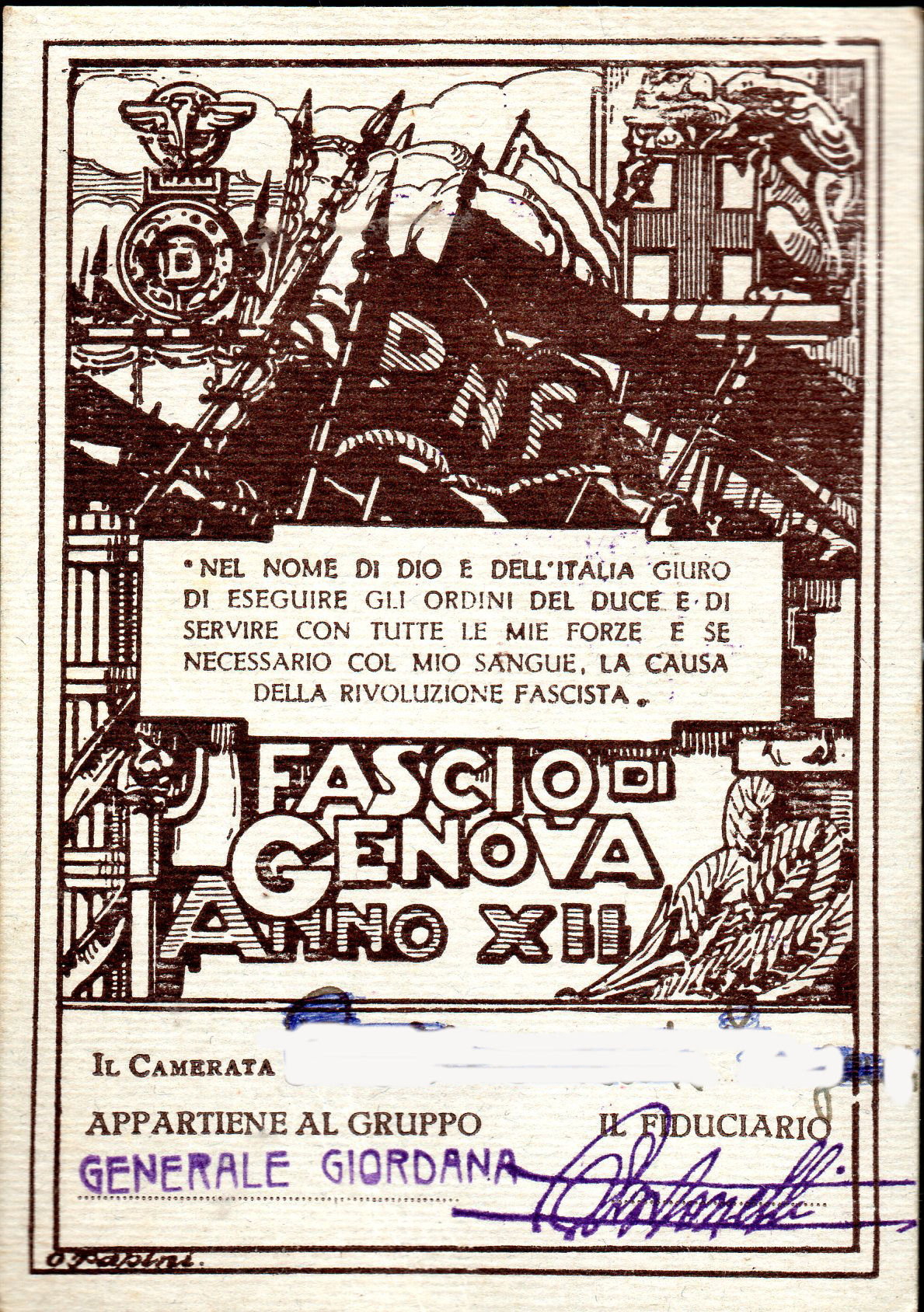 Tessera del Fascio di Genova Sez. Generale Giordana Anno XII.