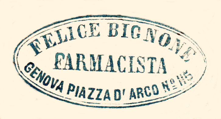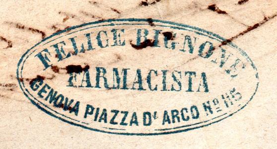 Timbro in uso presso la farmacia Pignone di Genova, piazza D'Arco n°85.