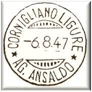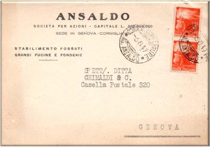 Cartolina commerciale affrancata con due valori da lire 4 della serie democratica, annullati col bollo "CORNIGLIANO LIGURE AG.ANSALDO" in data 6 agosto 1947.