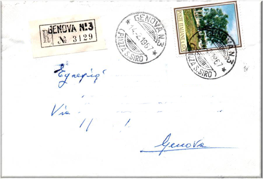 Lettera raccomandata per città affrancata con 2 valori da cent.75 emissione del 1926 e annullati con il bollo GENOVA SUCC-LE 3 (VIA FOSSATELLO) in data 30. 7. 29.
