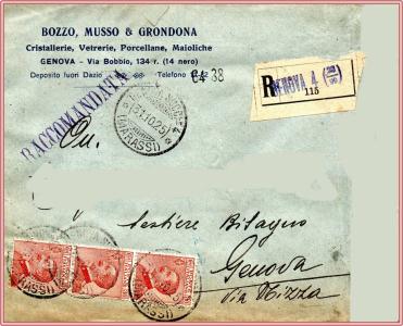 Lettera raccomandata per Genova, affrancata con tre valori della serie Michetti da cent.30.