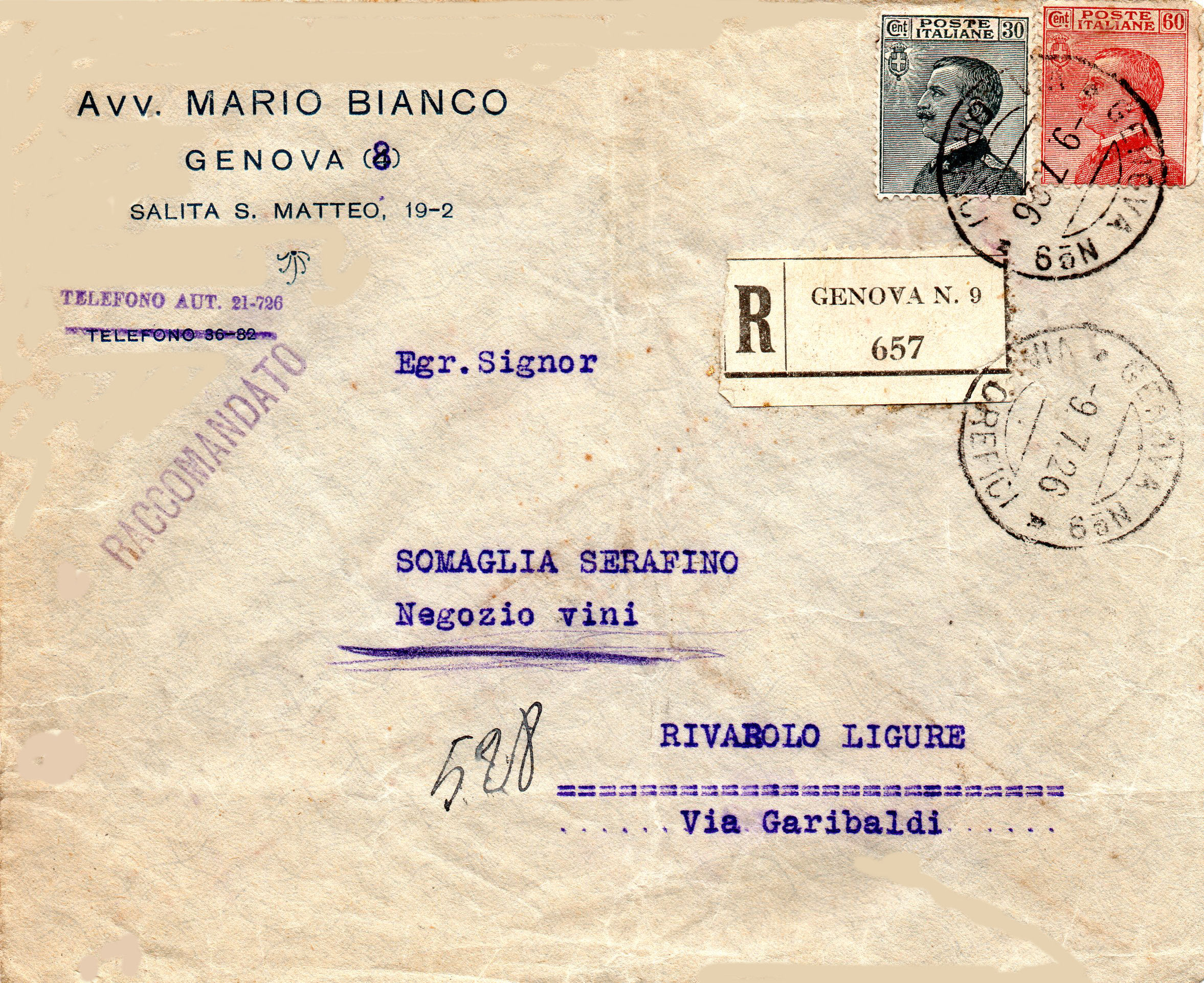 Questa raccomandata è partita da Genova il 9 luglio 1926, dalla succ. 9 di via Orefici, i fb. vengono annullati con il guller Genova succ.n°9 (via Orefici).