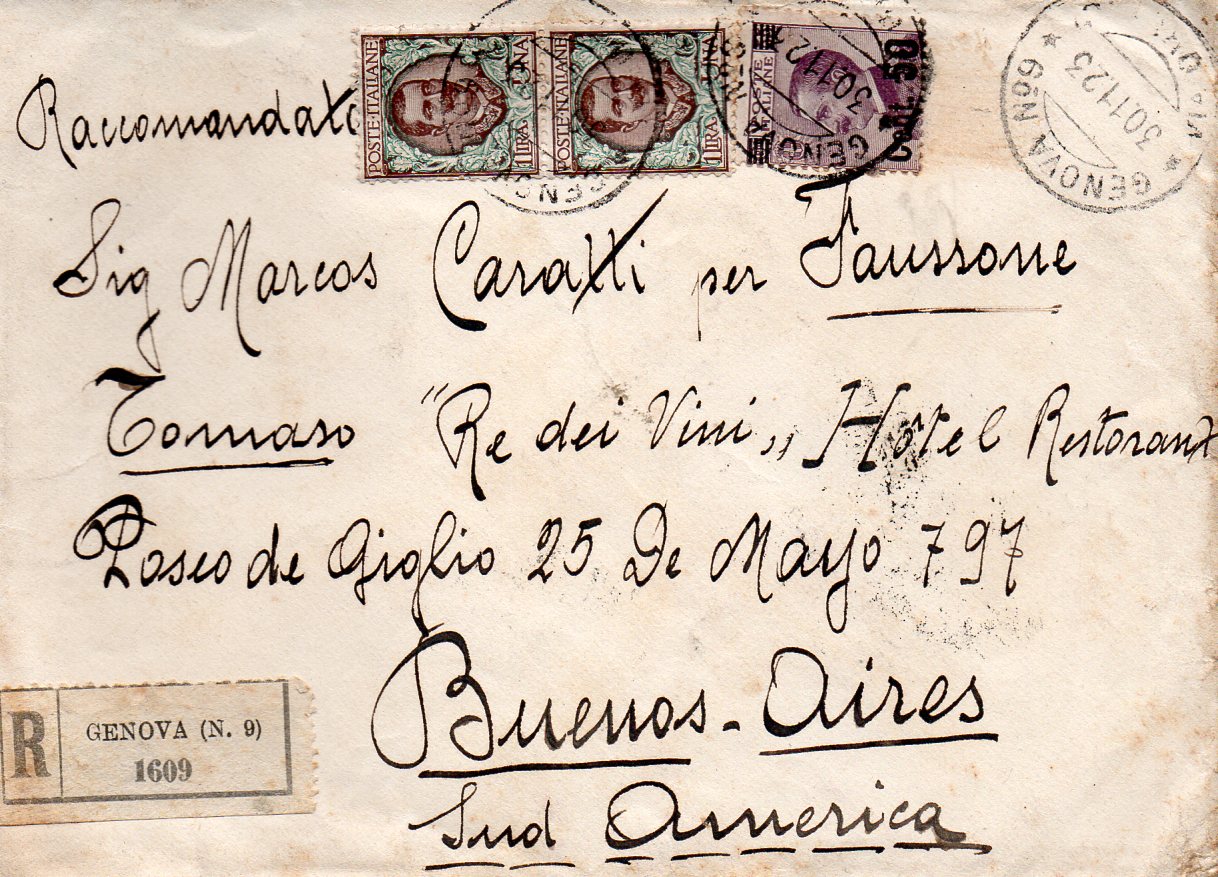 Questa raccomandata è partita da Genova il 30 novembre 1923, dalla succ. 9 di via Orefici, i fb. vengono annullati con il guller Genova succ.n°9 (via Orefici).