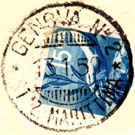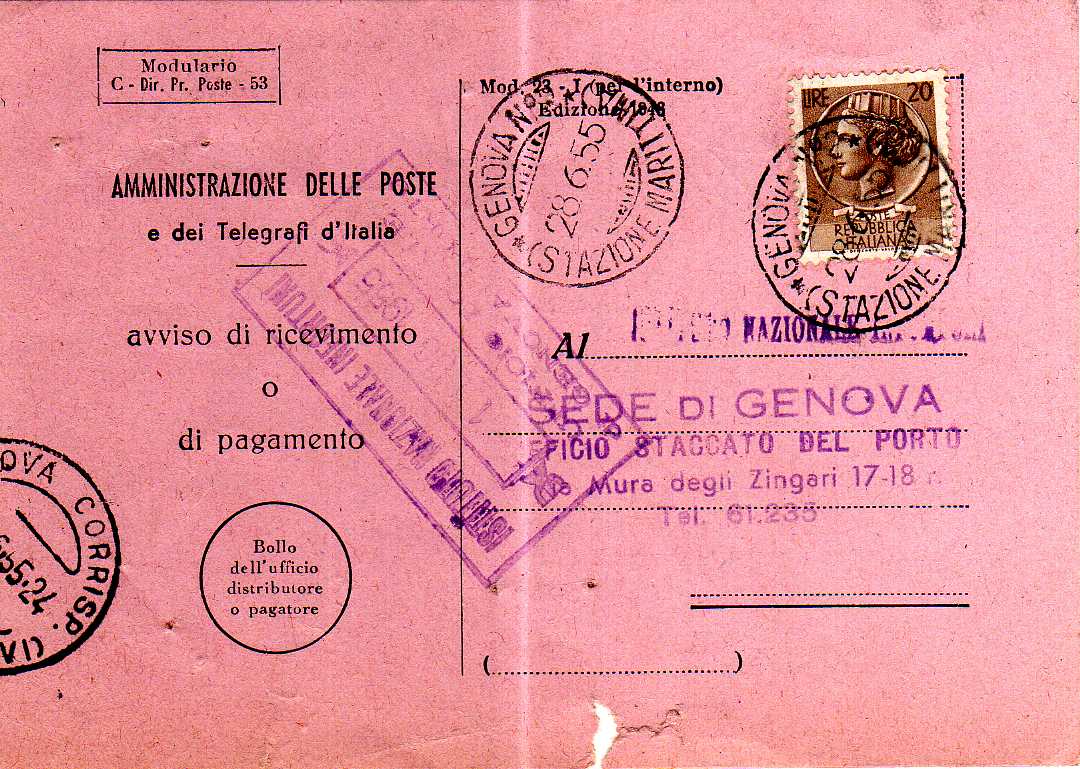 Annullato con il bollo GENOVA N° 2 (STAZIONE MARITTIMA) in data 28.6.55.