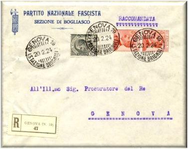 Annullata con il bollo GENOVA n°19 (Stazione Brignoli) in data 20 febbraio 1924.