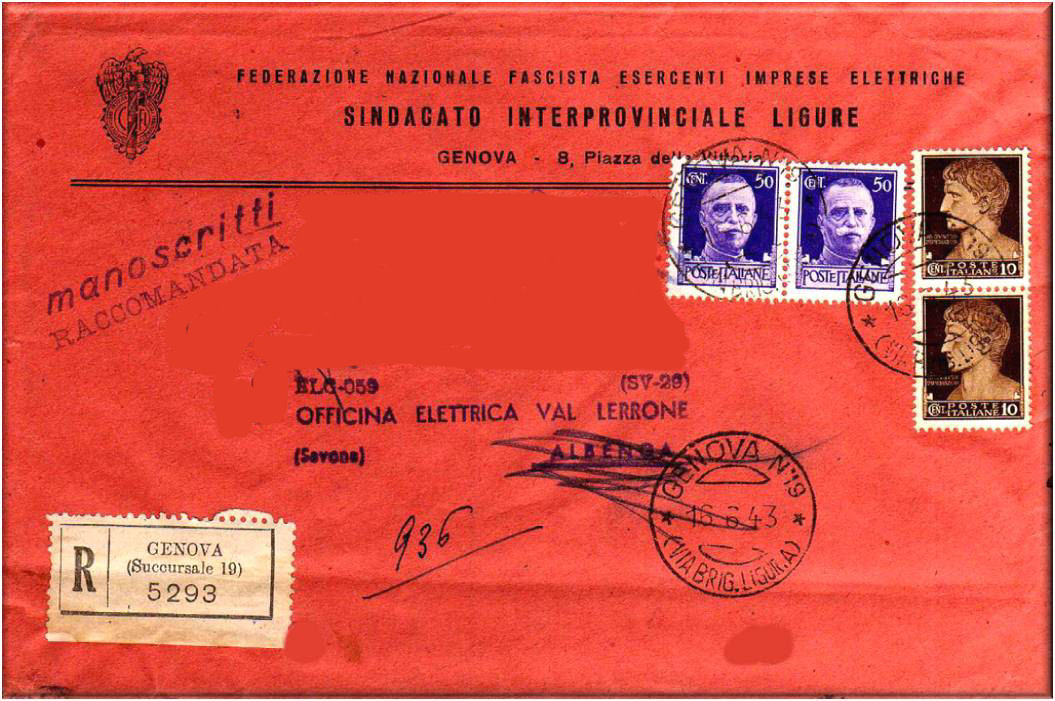 Annullati con il bollo GENOVA n°19 (VIA BRIGATA LIGURIA) in data 16 giugno 1943.