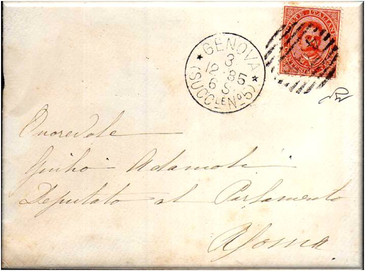 Lettera con annullo a sbarre viaggiata in data 3 dicembre 1885 per Roma, affrancata con un valore da cent. 20 della serie Umberto I.