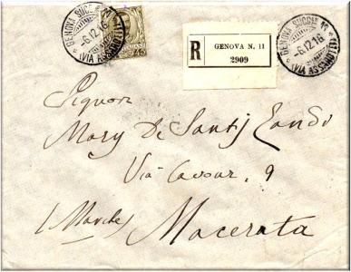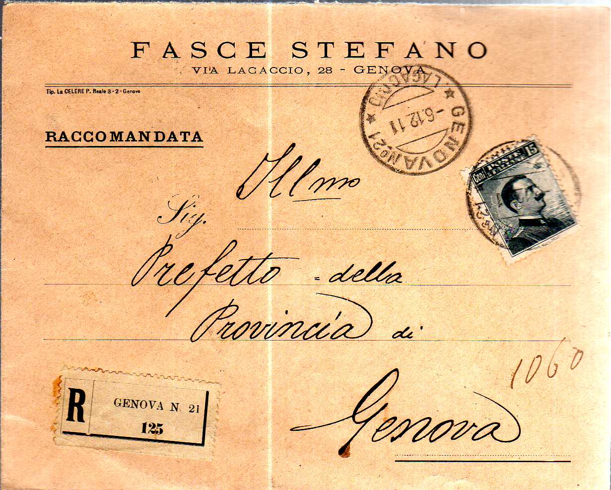 Lettera raccomandata per Genova, affrancata con un fb per un importo di cent. 15.