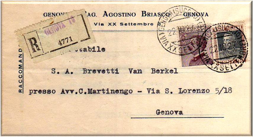 Questa raccomandata è partita da Genova il 27 ottobre 1927, dalla succ. 9 di via Orefici, i fb. vengono annullati con il guller Genova succ.9 (via Orefici).