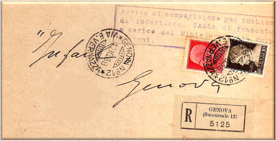 Annullati con il bollo GENOVA SUCC.LE 12 VIA ETTORE VERNAZZA in data 17 ottobre 1938.