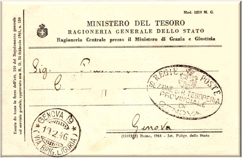 Destinazione Genova, Annullata con il bollo GENOVA 19 (VIA BRIG. LIGURIA) in data 16 febbraio 1946.