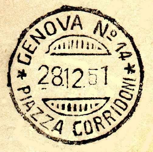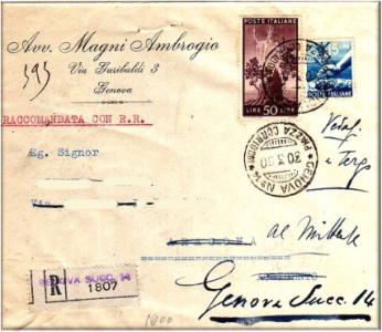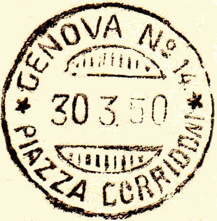 Annullato con il bollo GENOVA n°14 PIAZZA CORRIDONI in data 9 marzo 1950.