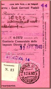 Annullato con il bollo GENOVA n°14 PIAZZA CORRIDONI in data 14 aprile 1940.