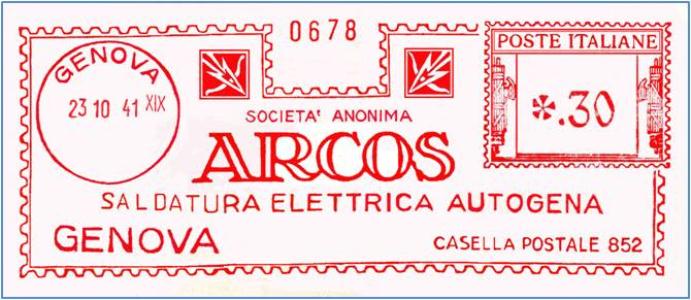 Impronta meccanica della Società Anonima Genovese ARCOS, specializzata nella fornitura per la saldatura elettrica e autogena.