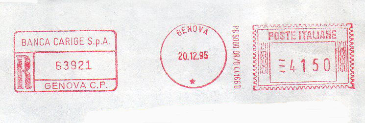 impronta del 20 dicembre 1995, con tassello personalizzato per raccomandata, in appoggio all'Ufficio postale di Genova C.P.