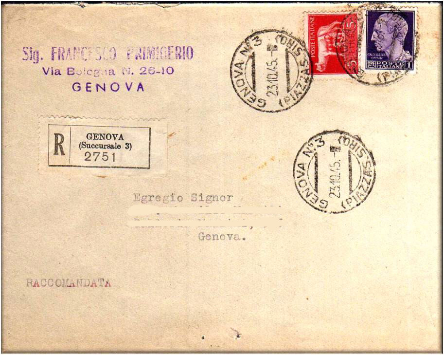 Annullati con il bollo GENOVA N°3 (PIAZZA S.SIRO) in data 23. 10. 45