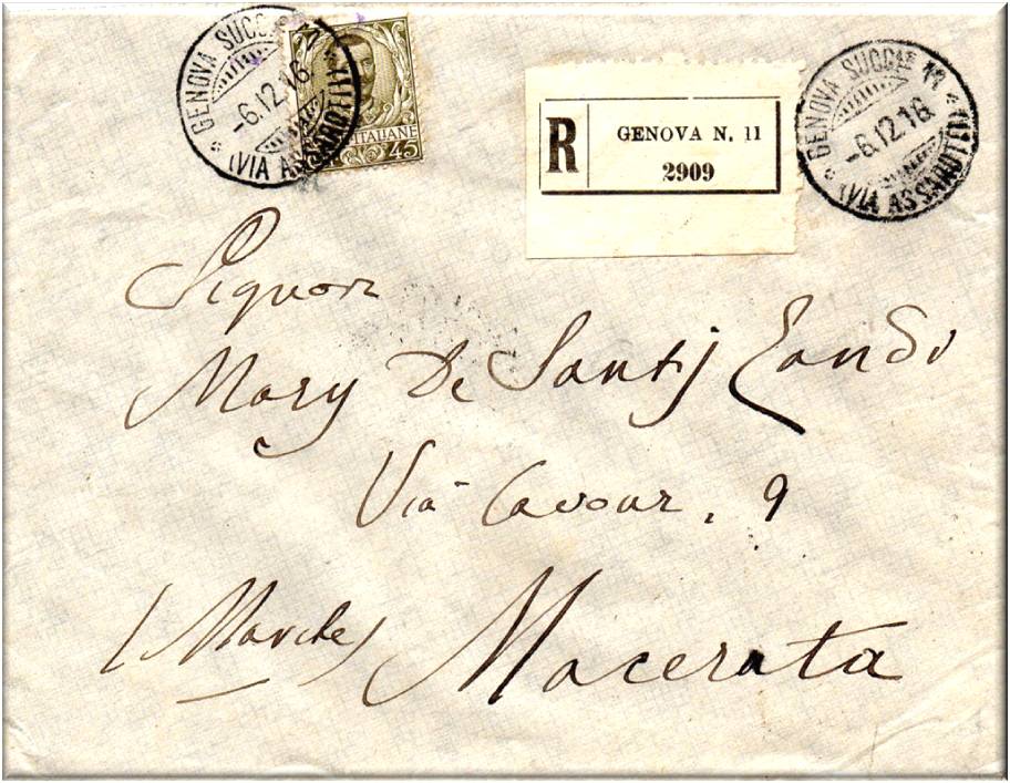 Lettera Raccomandata da Genova per Macerata in data 6 dicembre 1916
