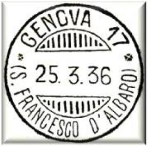Descrizione del timbro: cerchio semplice, al centro la data con giorno, mese e anno e il nome della zona di ubicazione dell'ufficio postale, in questo caso S.Francesco d'Albaro. Due asterischi dividono i due settori del timbro.