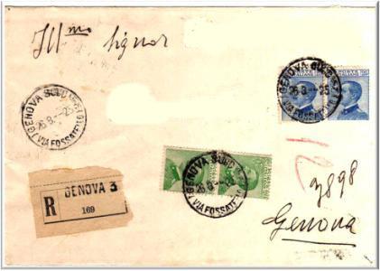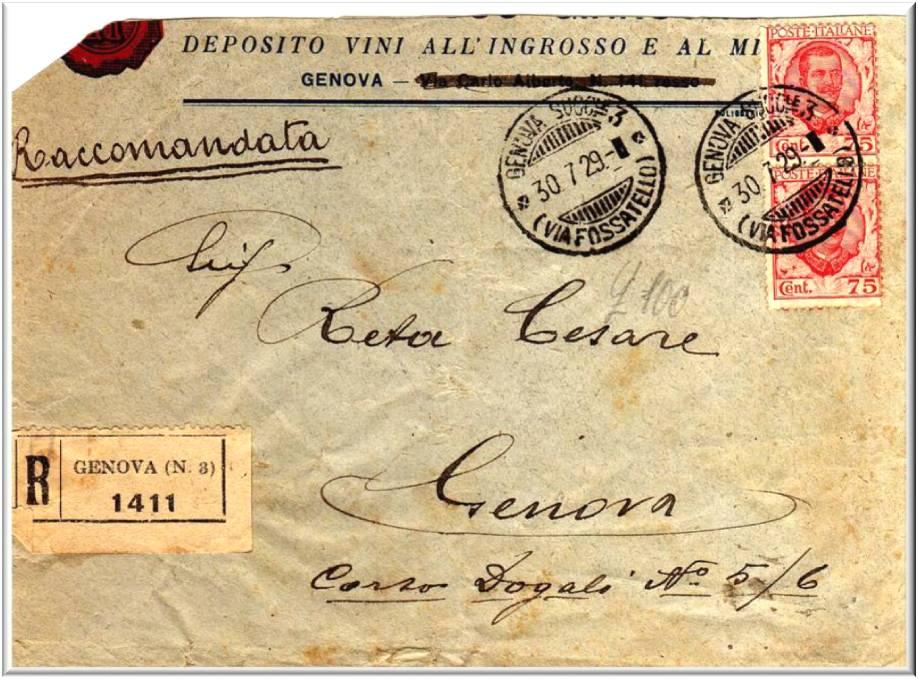 Lettera raccomandata per città affrancata con 2 valori da cent.75 emissione del 1926 e annullati con il bollo GENOVA SUCC-LE 3 (VIA FOSSATELLO) in data 30. 7. 29.