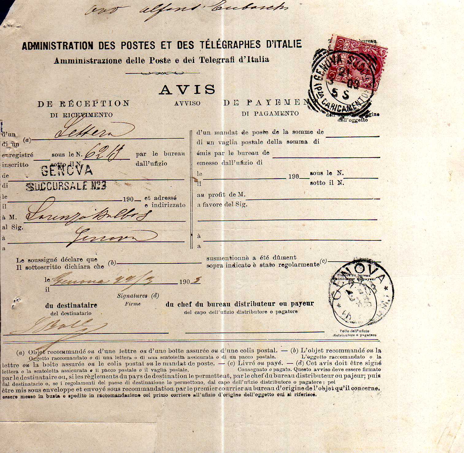 Nella ricevuta anche il lineare Genova Succursale n°3 su due righe.