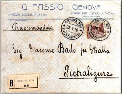 Lettera raccomandata per Pietraligure, affrancata con un valore della serie Michetti da cent.40 bruno emesso nel mese di gennaio del 1908.