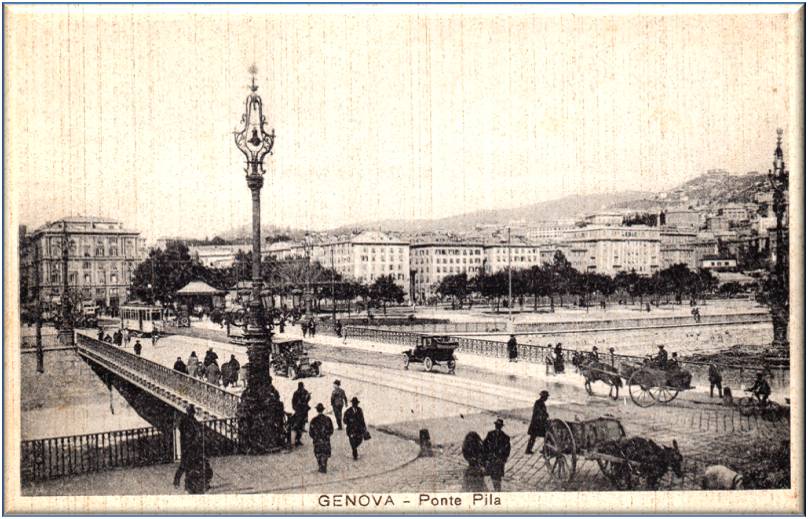 Si vedono dei tendoni nella piazza di Francia così chiamata all'ora quella che oggi è piazza della Vittoria, a sinistra il ponte Pila, mentre sul fondo a destra tra gli alberi si intravvede l'ex macello civico poi trasferito a Ca de Pittà.