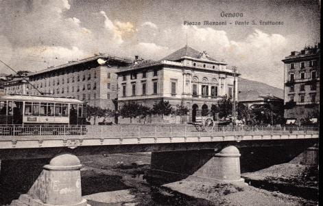 Cartolina viaggiata in data 1 gennaio 1913, lo stabile che si vede in primo piano era stato costruito per essere la sede del comune di San Fruttuoso, venne terminata la costruzione quando S,Fruttuoso venne accorpato a Genova, il progetto è dell'Ingegner. Pietro Pellas, lo stabile divenne poi la scuola magistrale Baliano, oggi è sede del consiglio circoscrizionale di S,Fruttuoso.