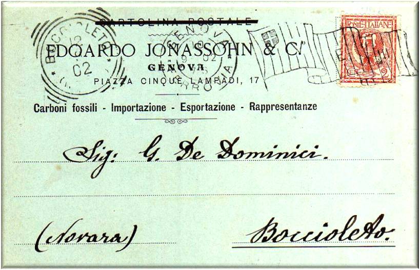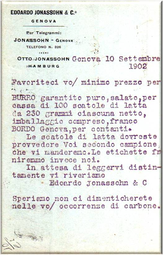 Dal testo della cartolina si capisce che la ditta Jonassohn trattava diversi prodotti tra cui anche il burro, lo scrivente alla fine dello scritto rammenta al suo fornitore di non dimenticare le eventuali occorrenze di carbone.
