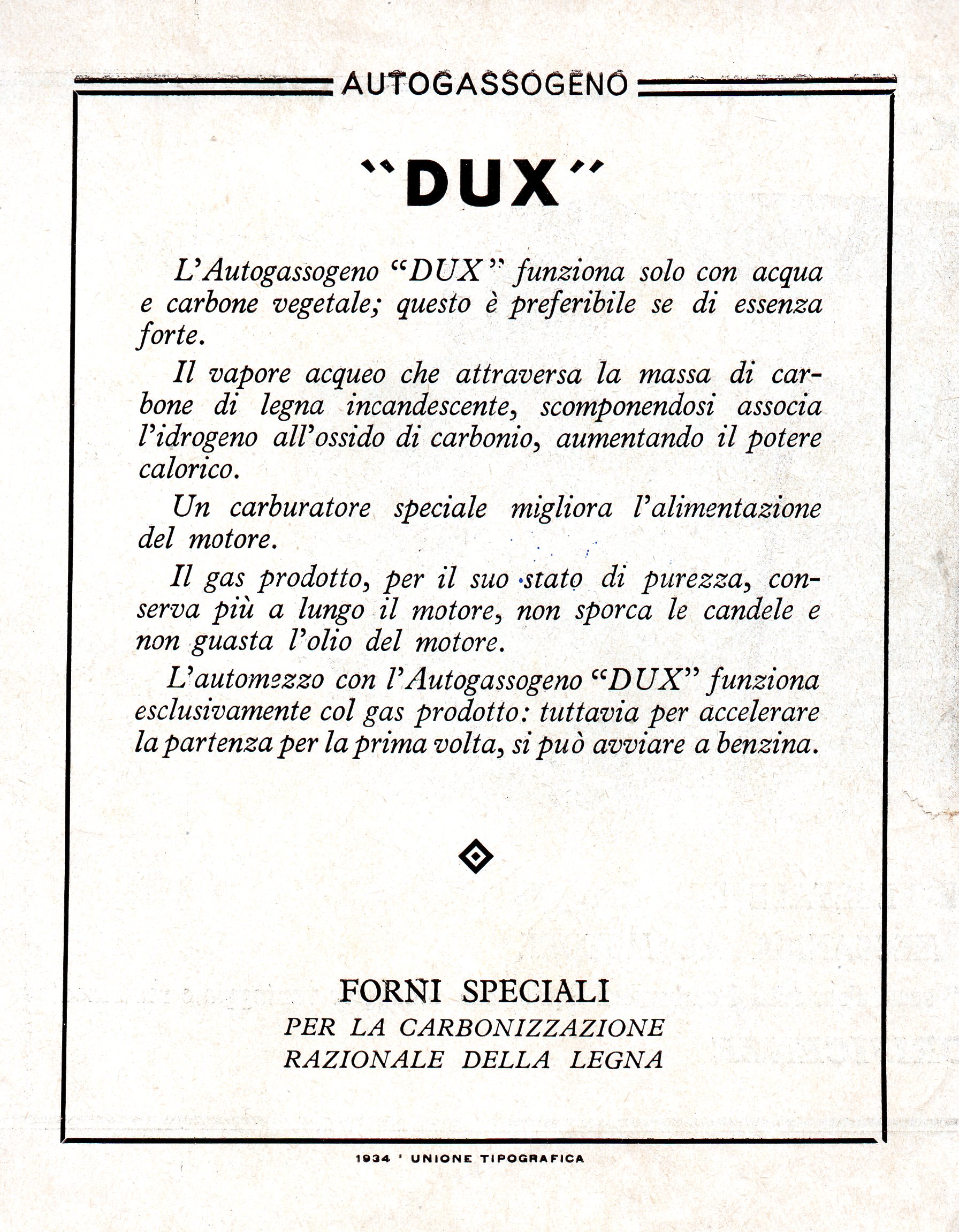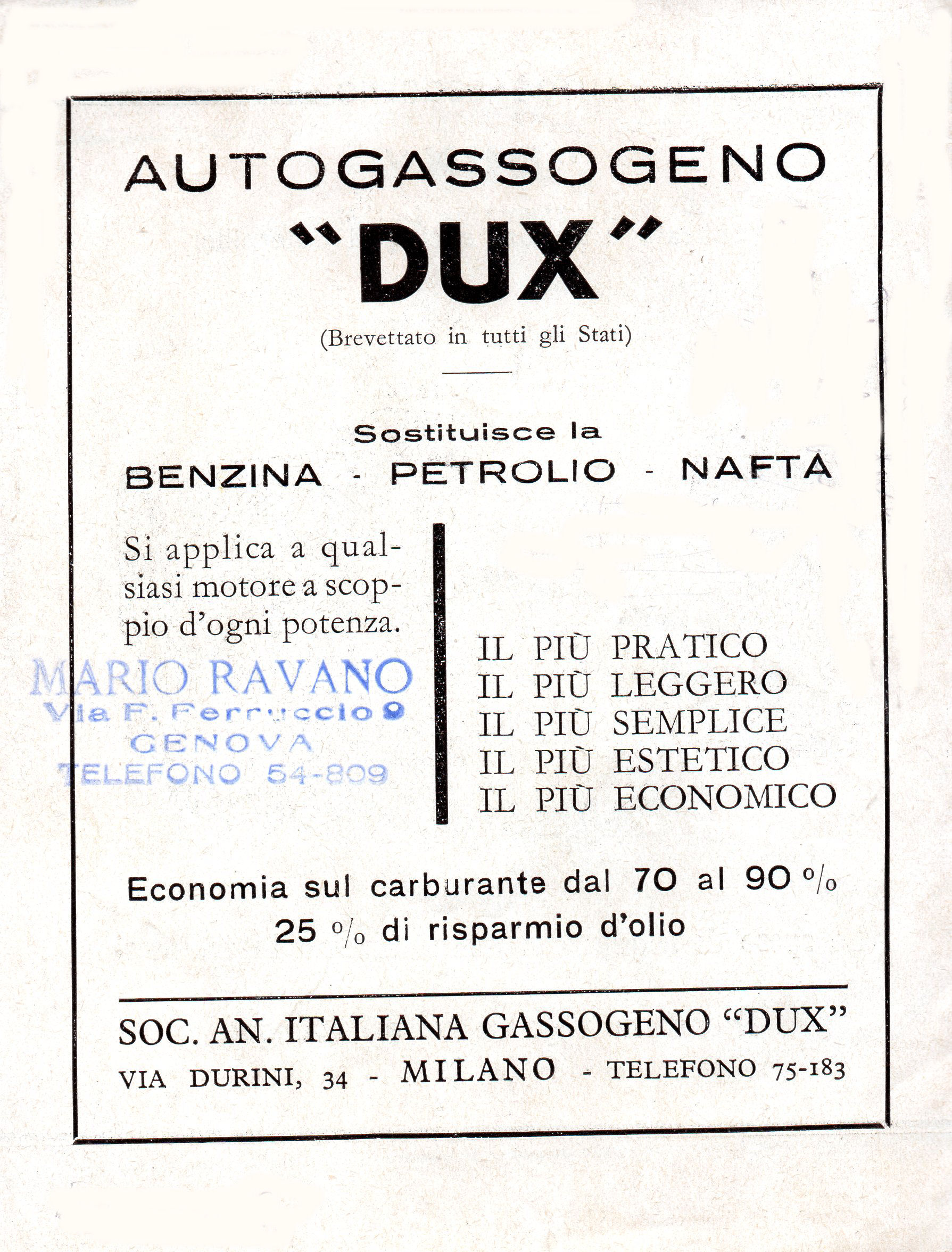 Opuscolo ripiegato in diverse parti, distribuito a Genova dalla ditta Mario Ravano, rappresentante di questo sistema chiamato "AUTOGASSOGENO DUX" che permette un ottimo risparmio energetico per il funzionamento di varie attrezzature, in parte visibili nell'opuscolo.