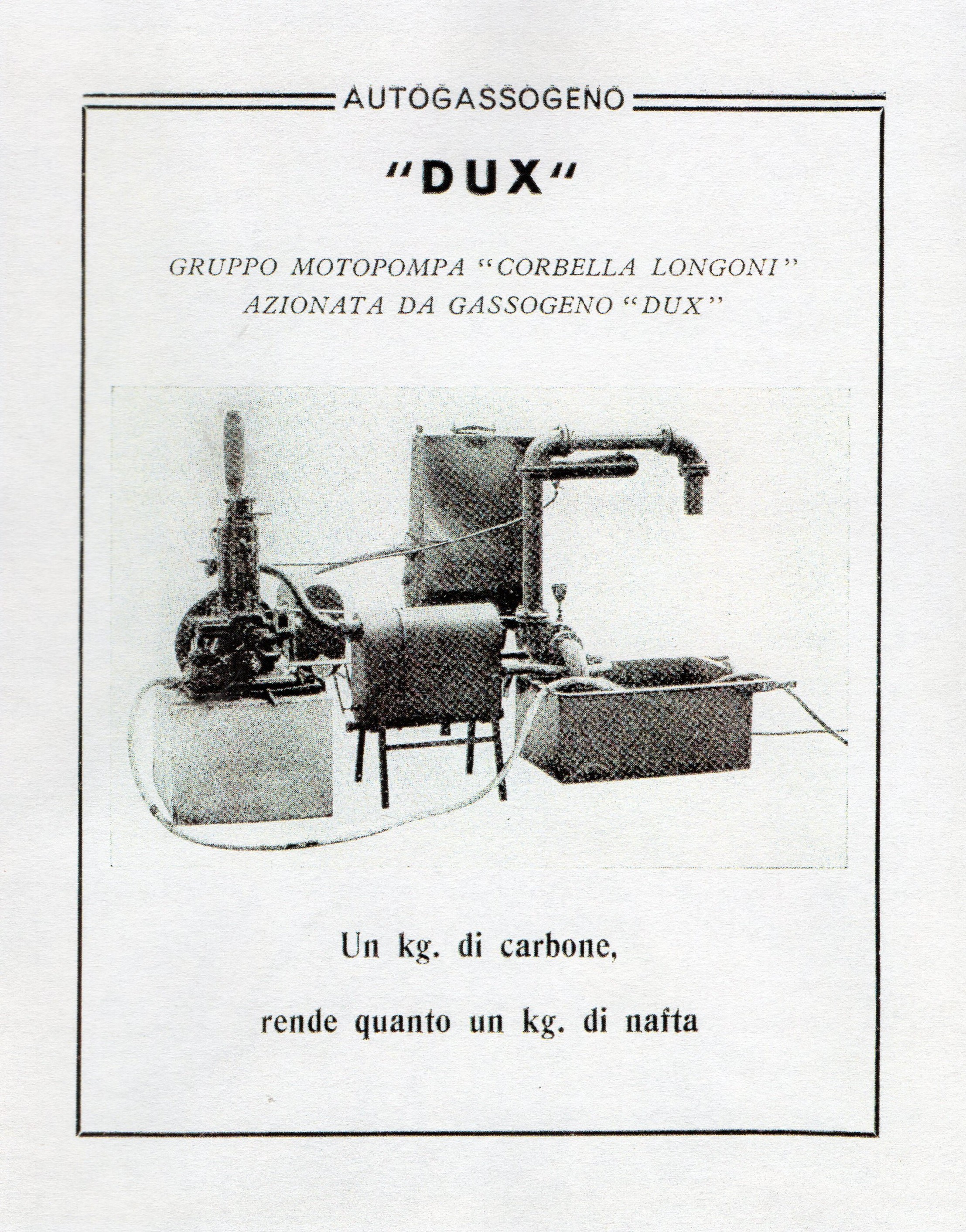 Quì abbiamo un'altro esempio del sistema applicato in questo caso ad una motopompa "Corbella Longoni", sotto i dati di confronto tra un kg. di carbone che rende quanto un litro di nafta.