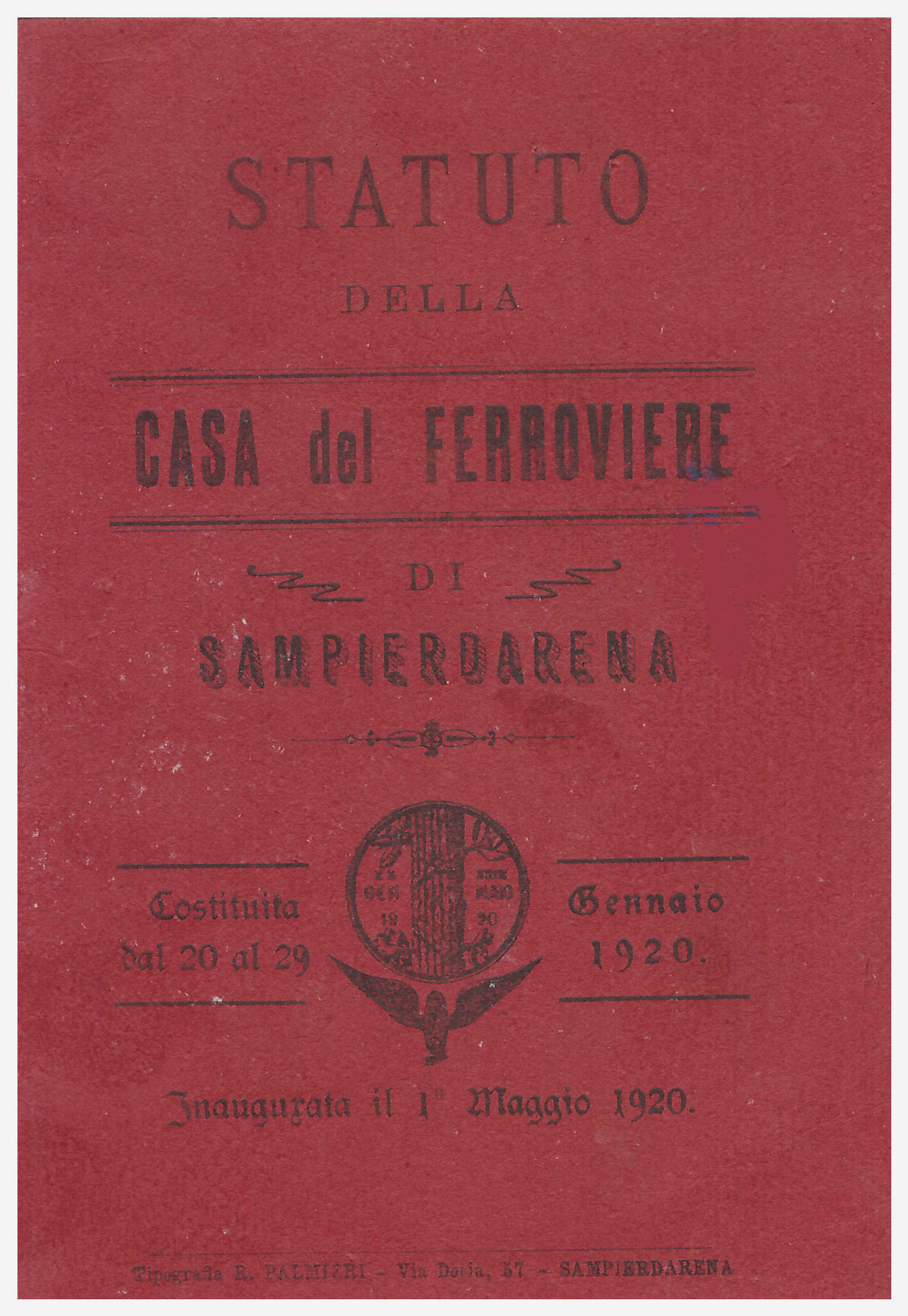 Libretto contenente lo statuto della Casa del Ferroviere di Sampierdarena, costituita nel gennaio del 1920, e innaugurata il 1° maggio 1920.