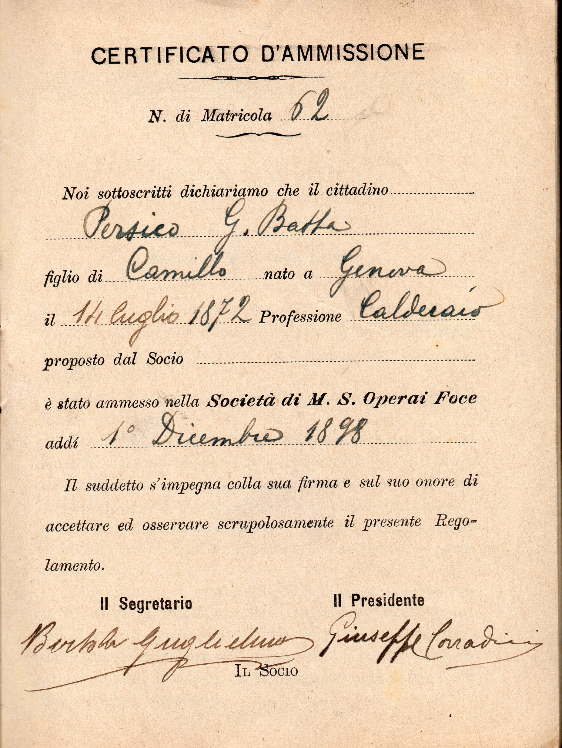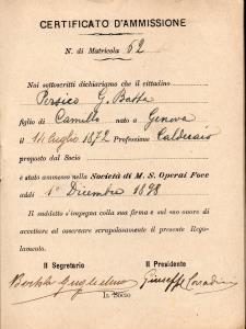 Questo libretto riporta il nome del Socio Persico Gio Batta nato il 12 luglio 1872 di professione Calderaio, ammesso nella Società il 1° Dicembre 1898, gli venne affidato il numero di matricola n°22.