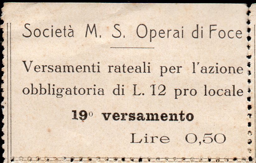 Etichetta trovata all'interno del libretto, inerente ai versamenti rateali per l'azione obbligatoria di L. 12 pro locale, riguarda il 19° versamento di L. 0,50.