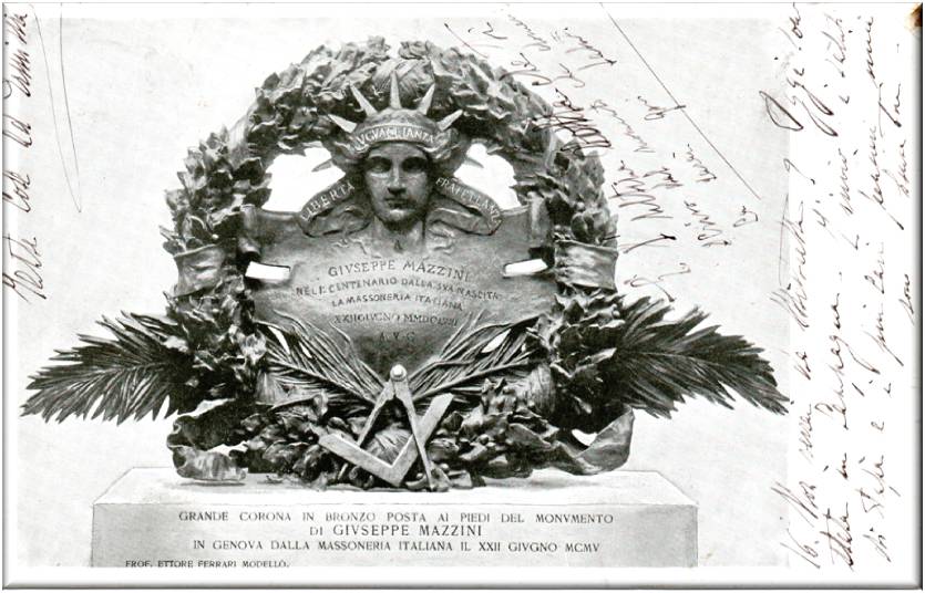 Nella cartolina è riprodotta la grande fusione in bronzo deposta ai piedi del monumento a Mazzini collocato a Genova in piazza Corvetto.