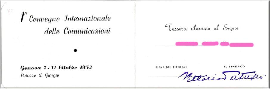 Tessera nominativa, emessa in occasione del 1° Convegno Internazionale delle Comunicazioni tenutasi a Genova nel 1953.