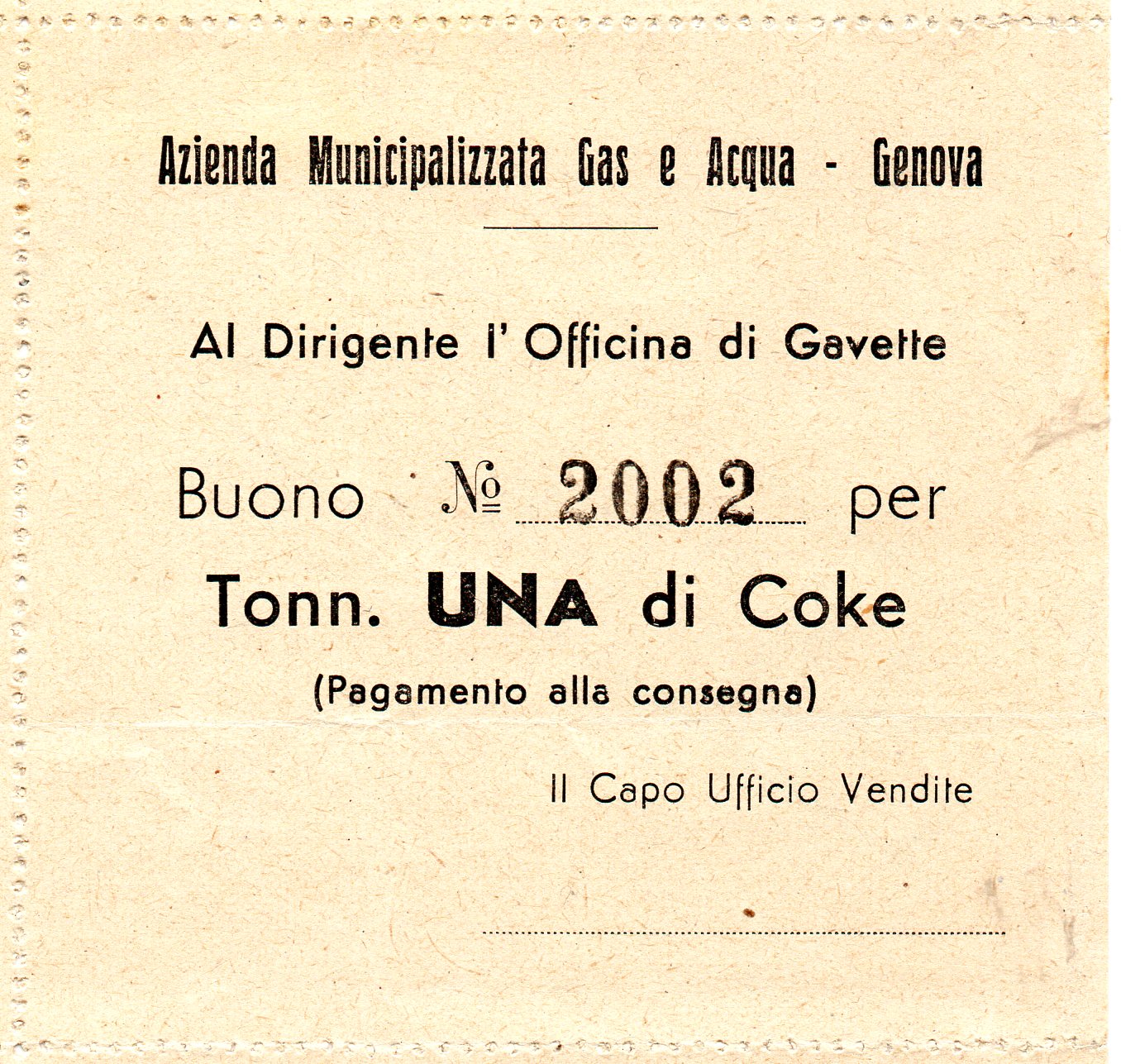 Tagliando da consegnare al Dirigente l'Officina di Gavette per il prelievo di una Tonnellata di carbone Coke.