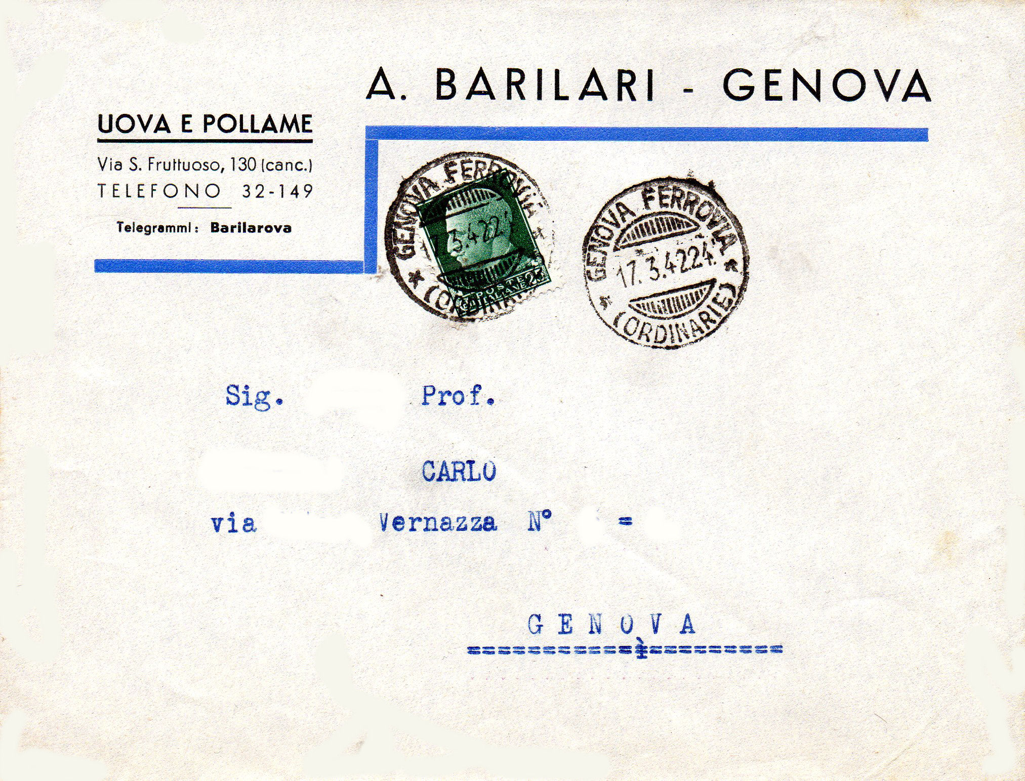 Busta commerciale della ditta Barilari A., specializzata in uova e pollame via S. Fruttuoso, 130 (canc.) conservati.