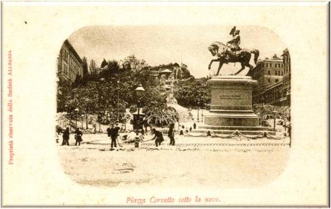 Cartolina nuova con veduta di Piazza Corvetto sotto la neve.