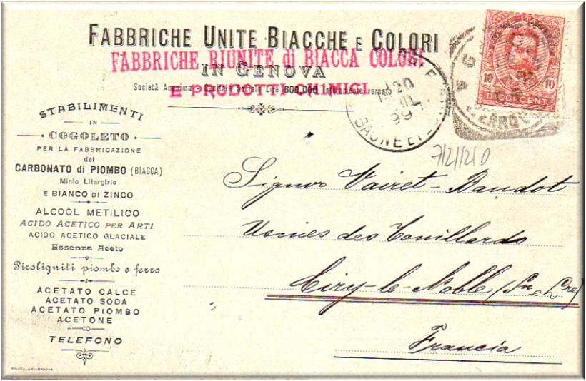 Cartolina pubblicitaria della ditta Fabbriche Unite Bicche e colori, con sede in Genova e stabilimento a Cogoleto.