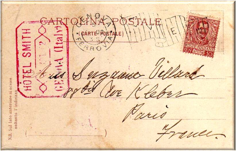 Cartolina acquistata presso l'Hotel Smith, lo dimostra il timbro posto al retro della cartolina, spedita il 20 febbraio 1906.